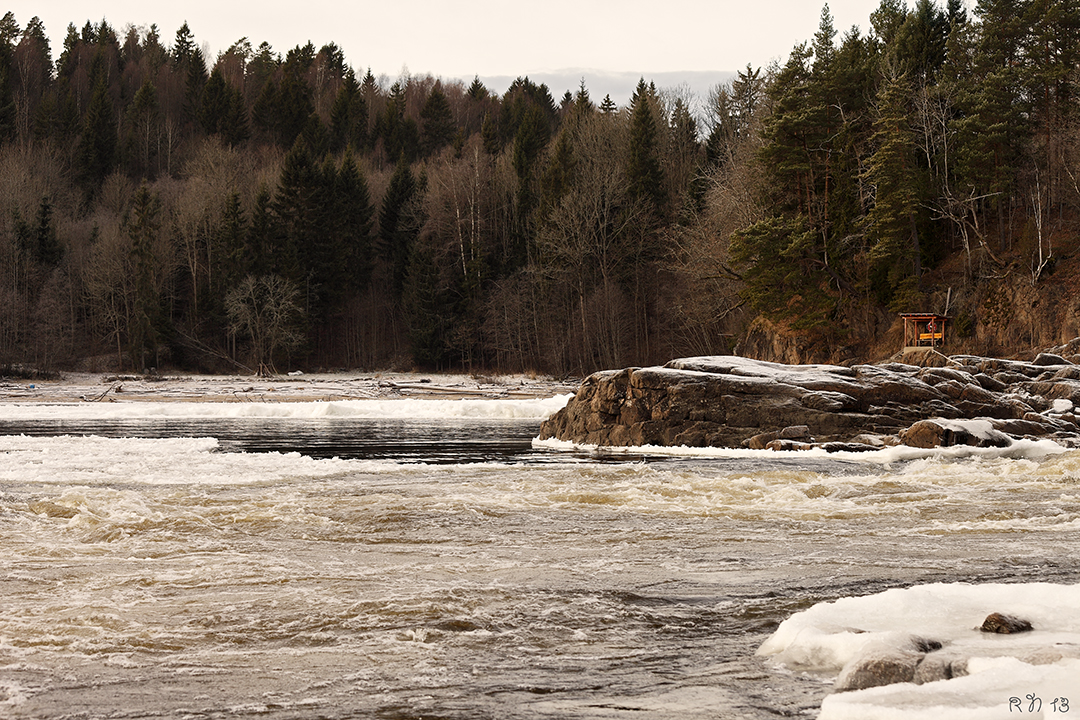 …i Holmsfoss. det skarpe lågadraget merkes godt i ansiktet, laksefisket er slutt og i mellomtida, fram til sportsfiskerne begynner å gjøre seg klare for en forhåpentligvis fin fiskesesong, lager fossen en fin og kald vinterstemning.