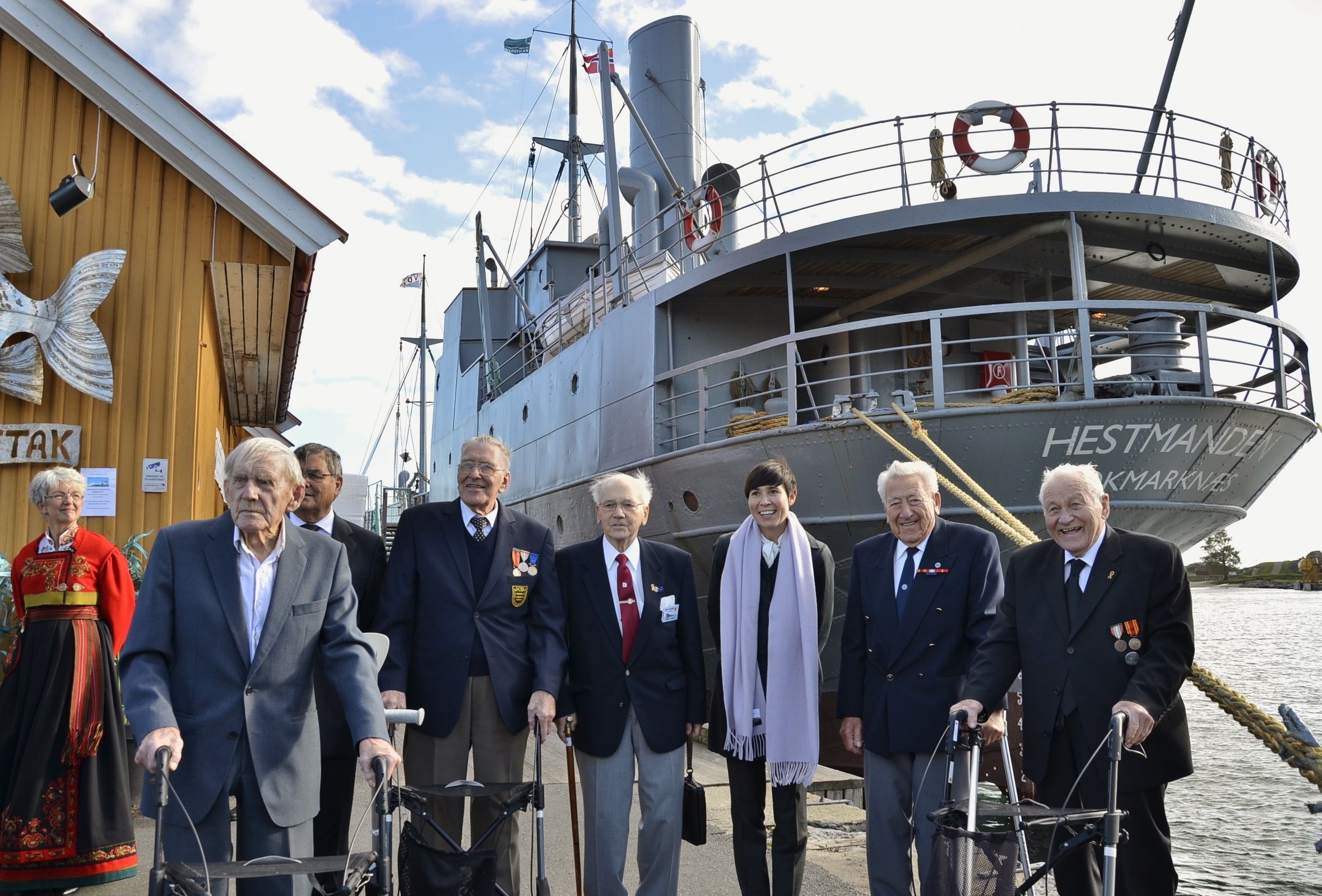 Noen av krigsseilerne sammen med Forsvarsministeren på Dampskipsbrygga med D/S Hestmanden i bakgrunnen. Fra høyre Helge Andresen fra Rekkevik, Søren Brandsnes fra Vågsbygd, Forsvarsminister Ine Marie Eriksen Søreide (H), Kåre Aarseth bosatt i Risør, Torleif Hansen fra Kvelde, Hans Olaf Sørum nestleder i styret for Sjømannshjemmet, Jacob Rauan fra Hedrum og i bunad Kari Solum den nye bestyreren på Sjømannshjemmet i Stavern.