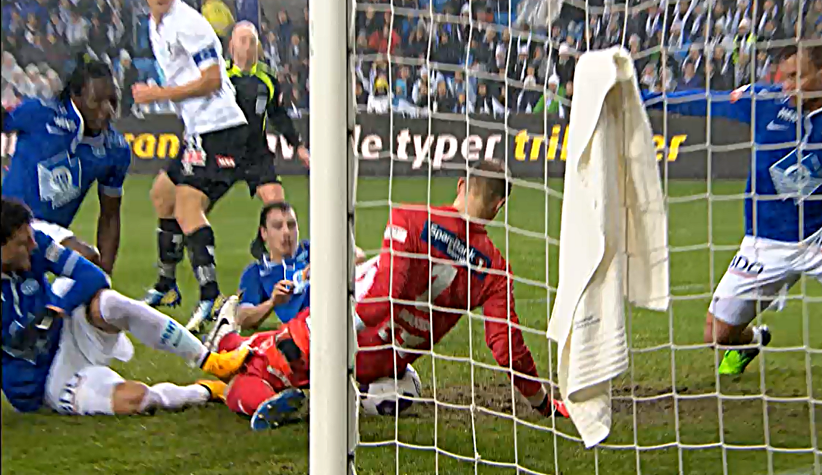 På slutten av første omgang kunne Molde allerede tatt ledelsen i kaampen, men Odds keeper fikk satt seg på ballen. Foto: PTAfoto