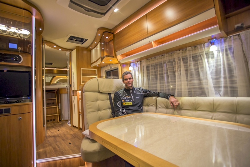– Ole Einar Bjørndalen har geniforklart bobilbruken i forhold til trening. Hans erfaringer gjorde meg svært nysgjerrig på å teste ut et slikt opplegg, forteller Thomas Alsgaard om sin nærmere ni meter lange bobilluksus med svært god plass.