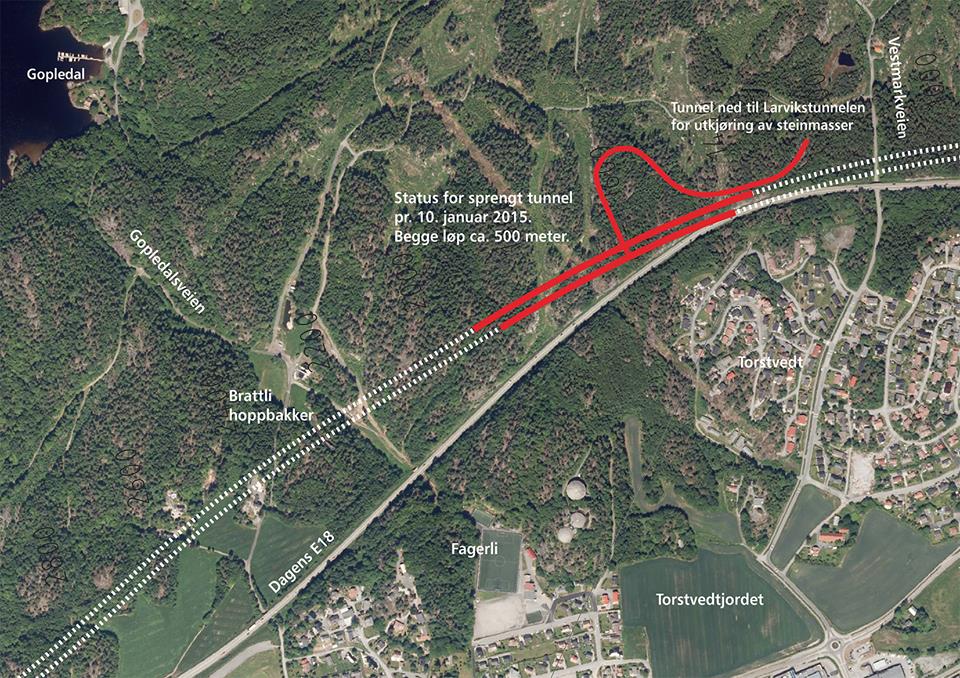 Illustrasjonen viser status for fremdrift i Larvikstunnelen pr. 10. januar. Hvert av de to løpene er nå sprengt ca. 500 meter. Det sprenges normalt ca. 20-25 meter i uka, med ca. 1 sprengning på hver «stuff» i døgnet.