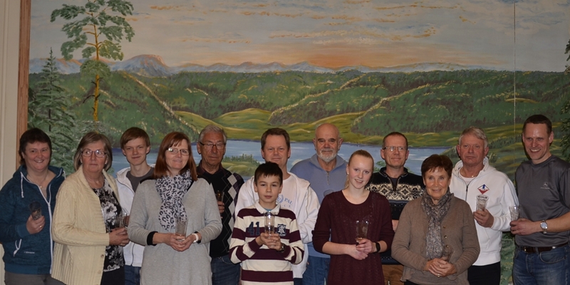 Klubbmestere 2014 i Hedrum O-lag fra venstre: May Nordkvelde, Anne Marie Ceeberg, Jarle Lysnes, Kari Reppesgård Holt, Anton Lomme, VIljan van Raaij, Roger Lysnes, Bjørn Ceeberg, Hanna Johansson, Tom Aasrum, Margith Reppesgård, Per Dag Nordkvelde og Jørgen Fjære. Øvrige klubbmestere Sindre R. Holt og Alvilde Karlsen var ikke tilstede da bildet ble tatt.