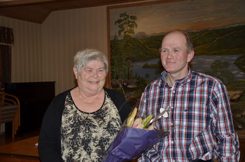 Unni Lysnes er ei av flere personer som bidrar til det gode miljøet i Hedrum O-lag. Her har hun mottatt velfortjente blomster av sportslig leder i klubben Anders Kristian Holt.