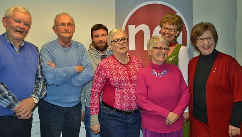 Styret og varamedlemmer i Vestfold Nei til EU, fra venstre: Ragnar Bjerknes, Aage Nordahl Nilsen, Bjørnar Kristoffersen, Eli Grinde, Bjørg N. Bjørnevik, Kathrine Kleveland (leder sentralt) og leder i Vestfold Anna Marie Frost. Heming Olaussen var ikke til stedet da bildet ble tatt.