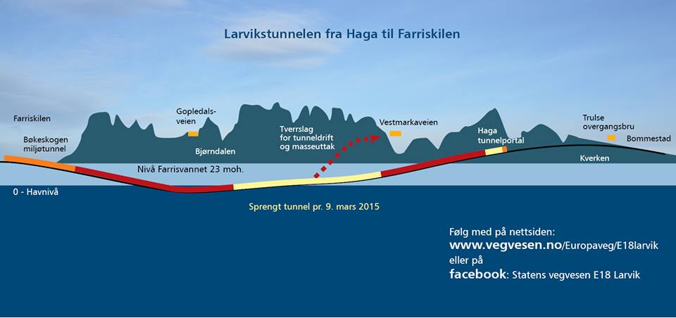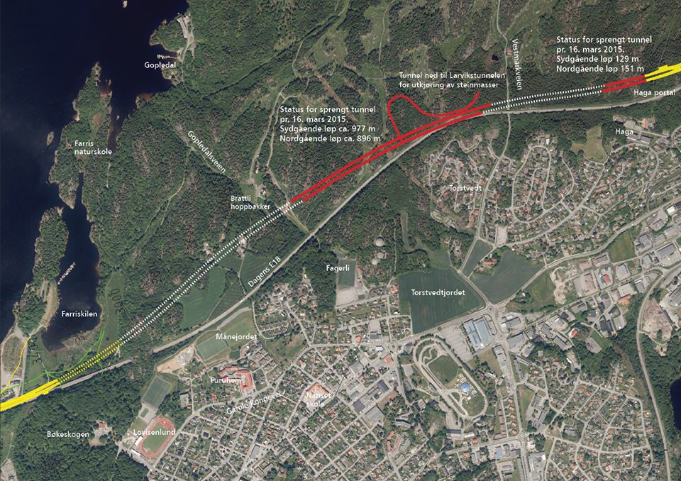 Her er to illustrasjoner som viser fremdriften i Larvikstunnelen, fra Haga til Farriskilen. Vi har passert 1 km i hvert løp av den 2500 meter lange tunnelen. Det sprenges som kjent innefra tunnelen i begge retninger. Og det sprenges sydover fra Haga. Noen steder støter man på dårlig fjell og slepper, og da må entreprenøren injisere med betong for å styrke fjellet før sprengning. Slike dårlige partier fører til ujevn fremdrift på stuffene. Slik det ser ut nå kan vi forvente gjennomslag nordover mot Haga en gang i juni, mens den lengre strekningen mot Farriseidet er planlagt ferdig sprengt i april 2016. Det er med andre ord lys i tunnelen…