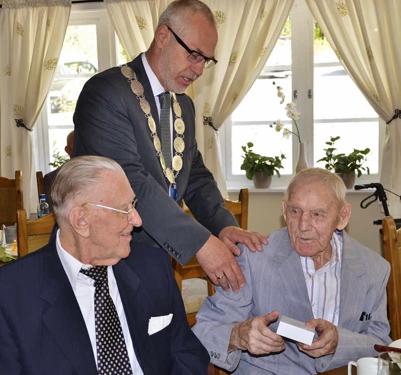 14 av de 21 bosatt i Larvik var tilstede og mottok hver sin Minnemedalje av Ordfører Rune Høiseth. 1. rekke fra venstre: Synnøve Thvedt Fønhus, Thorleif Hansen, Gudrun Therese Kjølnes, Helge Victor Andresen, Torger Bakkene og Ole Hedvard Holm. 2. rekke fra venstre: Leif Steinsholt, Jacob Rauan, Egil Roar Lunde, Baard Helle, Kaare Olsen, Jan Thomas Høeg, Jens Eidsten og Thor Rauan. I tredje rekke står representanter fra Larvik Forsvarsforening, Larvik Sjømannsforening, Heimevernet og Ordfører Rune Høiseth. Disse var forhindra fra å være tilstede og vil få sine velfortjente medaljer utdelt seinere: Ingvald Wahl, Trygve Laheim, Finn Hagen, Gunnar Foldvik, Odd Steinsholt, Liv Kathe Tvedten og Åse Marie Østby Døvle.