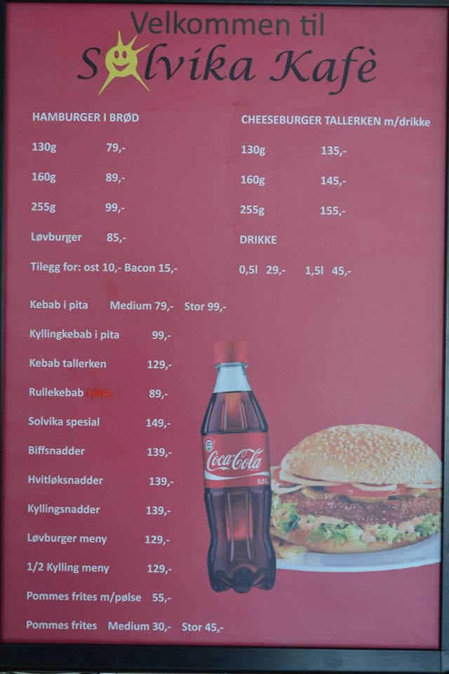 I tillegg til denne menyen blir det første uke : Dagens middag hjemmelaget lapskaus, kjøtt kaker i brun saus og Solvika spesial = Tyrkisk rett. (Dagens middag serveres fra kl. 14.00 til kl. 18.00.)