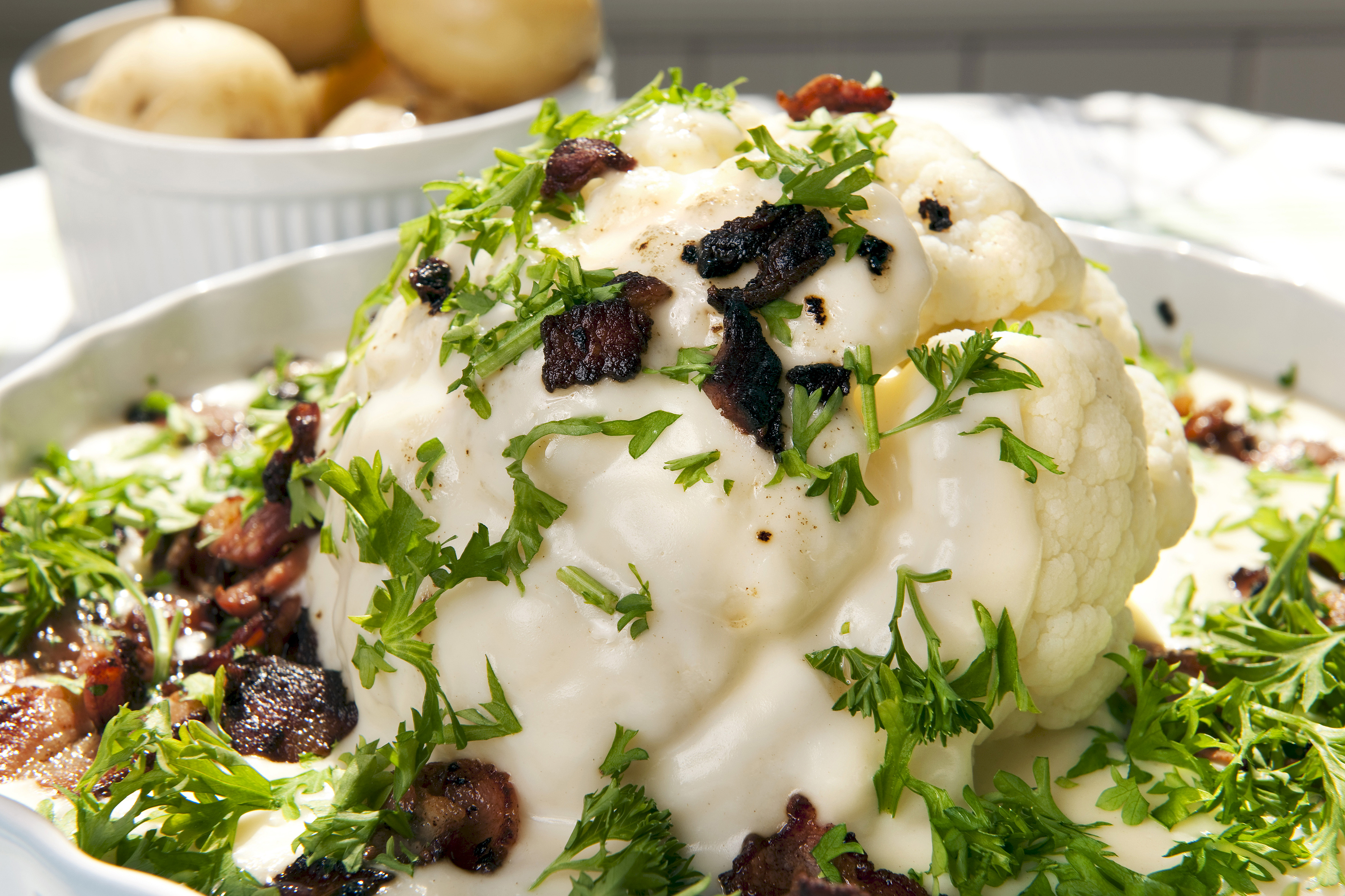 Nå er vi midt i den norske sesongen. Det bugner av helt ferske blomkålhoder. Bare så vidt gjennomkokt med en oste- eller rekesaus over, sammen med kokt skinke eller med stekte baconbiter over, halve kokte egg og tomater rundt på fatet. Kan et sommermåltid bli bedre?