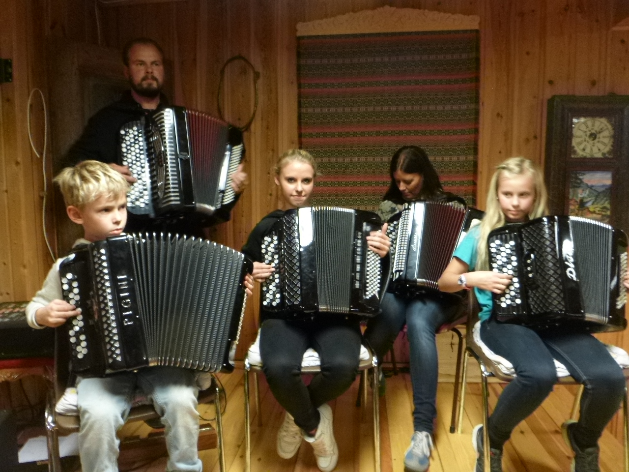 Ca 100 menesker hadde funnet veien til søndagskaffen på Hedrum Bygdetun, hvor familien Silk Johansen imponerte alle med trekkspillmusikk av høy klasse. Pappa Emil har vært Norgesmester på trekkspill flere ganger, og han har etter hvert fått med seg både kona og de tre barna. På bildet har vi pappa Emil og mamma Linda bak. Foran sitter detre barna, fra venstre Sander Emil (7), Olivia (14) og Emma (10). Vi er heldige som har en så musikalsk familie i vårt område. Og her er rekrutteringen sikret!