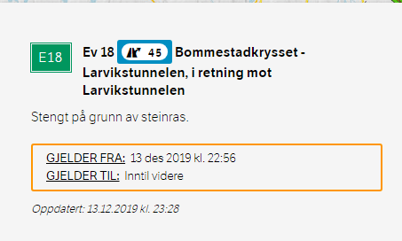 Stort steinras på Bommestad, E18 stengt i sydgående løp redaksjonen@norge24.no / 13. desember 2019 Det venstre felt i nordgående retning er også stengt. Del dette: Klikk for å skrive ut(åpnes i en ny fane) Skriv ut Klikk for å sende en lenke med e-post til en venn(åpnes i en ny fane) E-post Klikk for å dele på Facebook(åpnes i en ny fane) Facebook Klikk for å dele på X(åpnes i en ny fane) X Lik Laster inn...