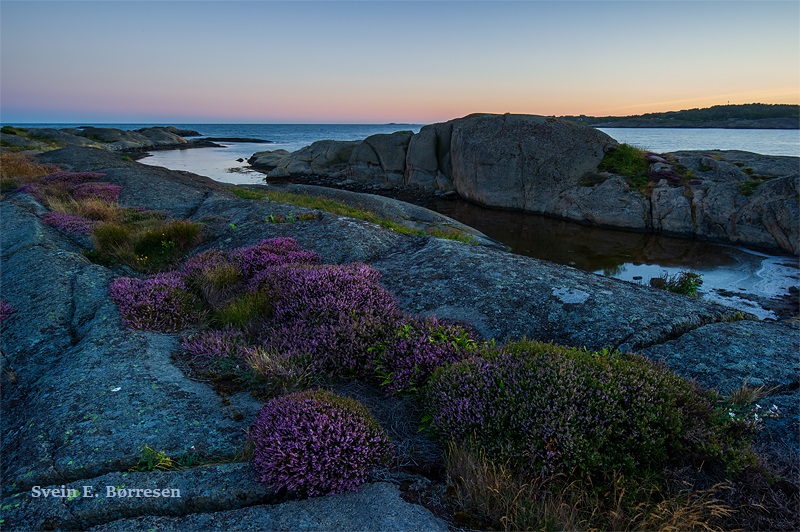 Ja, enkelte steder var svaberget mer eller mindre fiolett. Jeg har aldri på de årene jeg har vært naturfotograf langs kysten, opplevd maken til blomstring. Store og små tuer avløste hverandre i sprekker og revner. Og de sto i perfekt kontrast til einerbuskene. Et betagende syn.