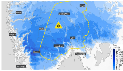 Yr skriver på sine sider at det mandag 1. mai er gult farevarsel for snø på Østlandet.